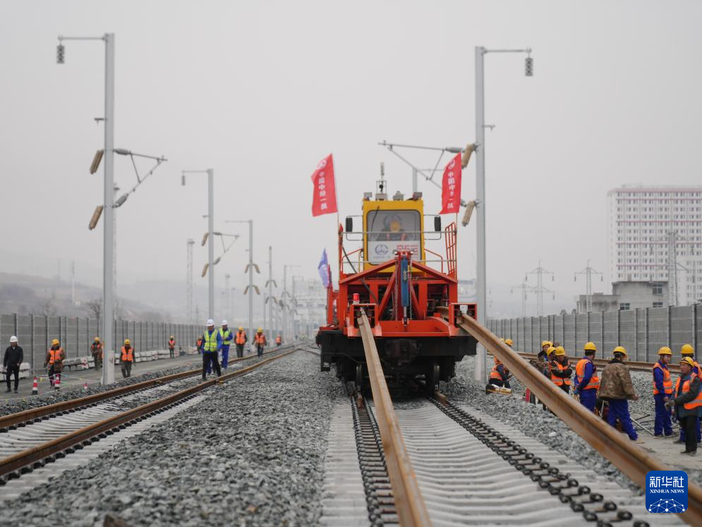 2月6日,中铁一局施工人员操作设备在西康高铁安康西站段铺设无缝钢轨。新华社记者 赵英博 摄